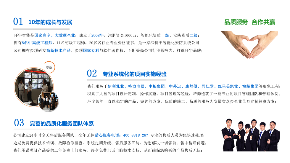 合肥市環(huán)宇智能工程有限公司成立于2008年科創(chuàng)版上市企業(yè),現(xiàn)注冊(cè)資金1000整,電子與智能化系統(tǒng)集成資質(zhì)壹級(jí),安防資質(zhì)級(jí),是“國(guó)家高新技術(shù)企業(yè)”、“合肥市高新技術(shù)產(chǎn)品認(rèn)定企業(yè)”、“安徽省安防協(xié)會(huì)會(huì)員單位”、“AAA級(jí)信用等級(jí)認(rèn)證企業(yè)”、“AAA級(jí)重合同守信用企業(yè)”、“合肥市創(chuàng)新型企業(yè)”、是行業(yè)領(lǐng)先的智能化整體解決方案的集成商